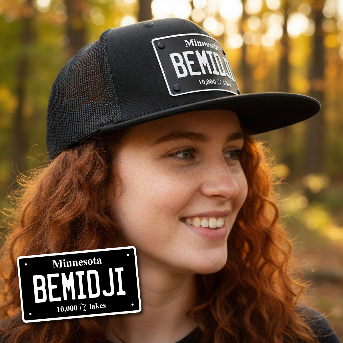 $25.00New “Bemidji Blackout” snapbacks have arrived! We recreated the iconic MN Blackout license plates in embossed metal and rivet them on in store! Available in both flat-brim and curved. #myBemidji